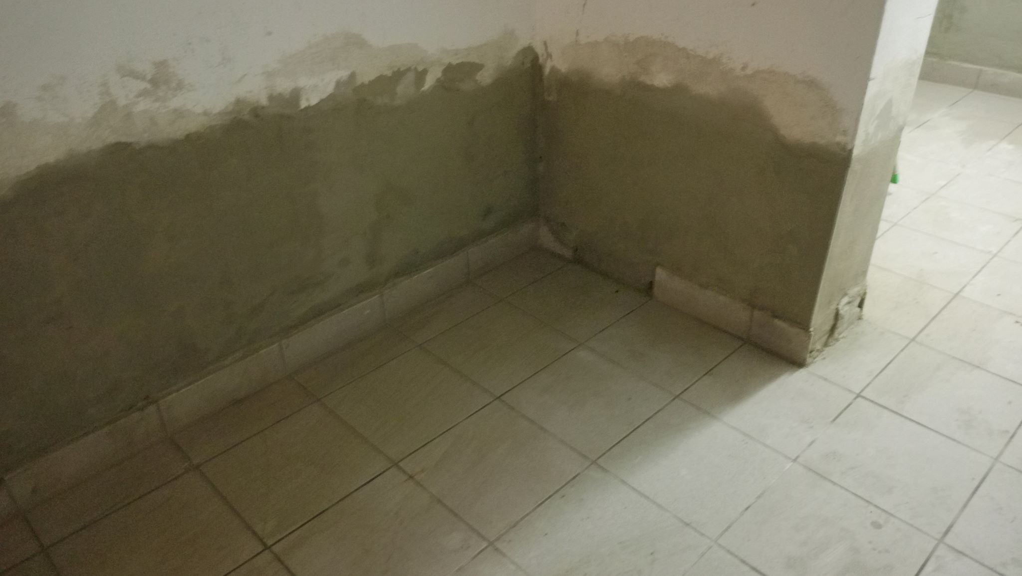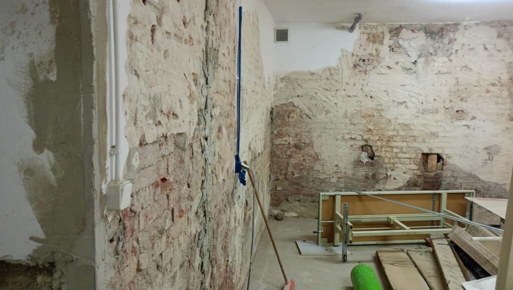 oczyszczenie oraz gruntowanie powierzchni  ścian przyziemia, z których wcześniej zostały zbite tynki i poddane osuszaniu,